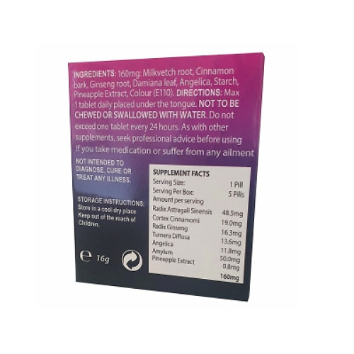 Ne pas avaler: Oui, vous avez bien lu, le FIVE se place sous la langue. Il est conçu pour optimiser vos performances sexuelles et votre érection. FIVE permet aussi un meilleur contrôle de l’éjaculation précoce et doit vous apporter érection durable.